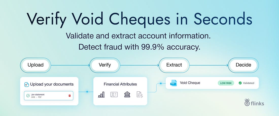 Flinks Upload delivers both: authenticating void cheques and bank statements in real time. Trained on 100M+ documents, Flinks detects up to 3× more fraud and confirms account ownership instantly.
